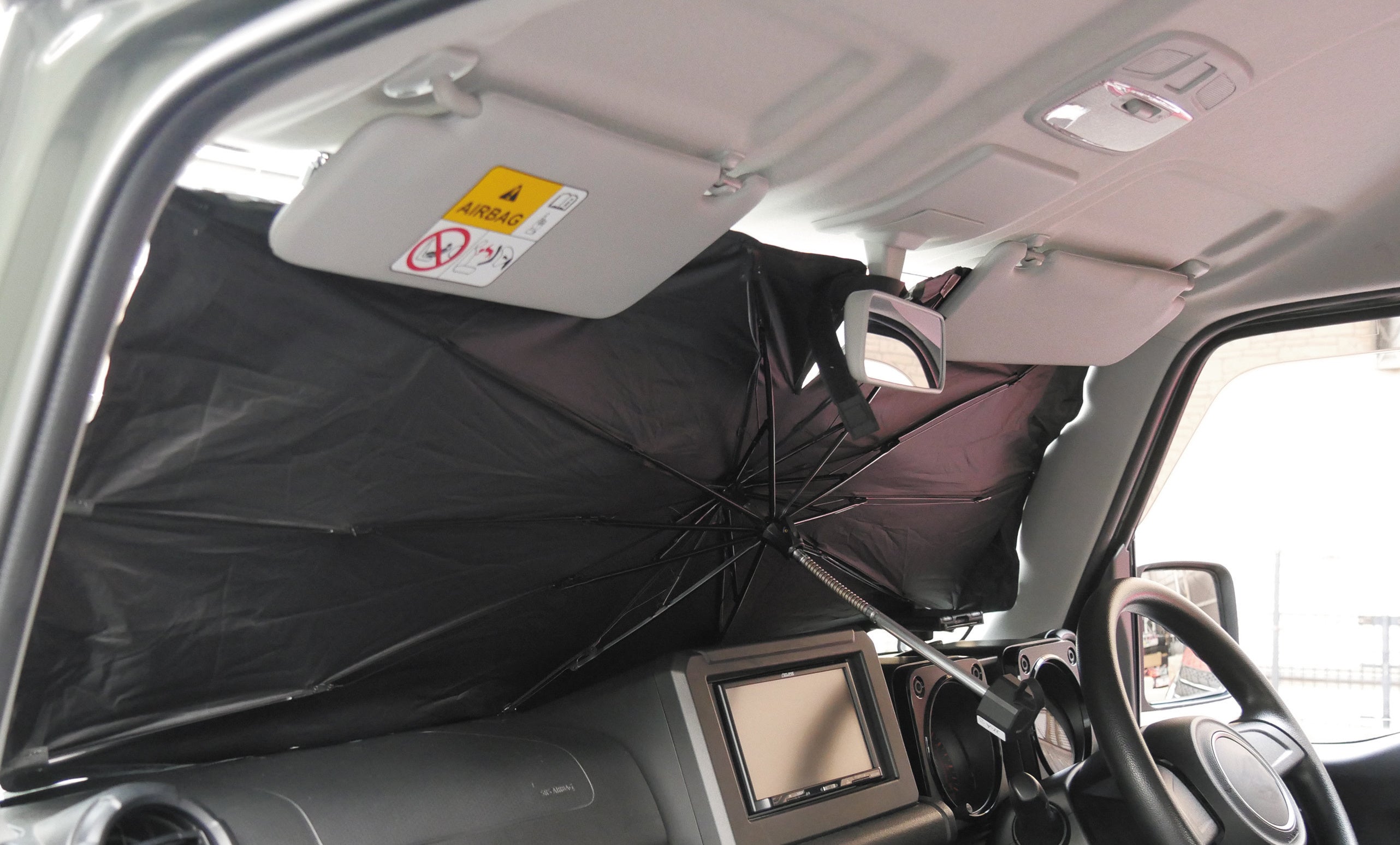 従来のフロントを覆う型のサンシェードは、折り畳んでも、長さもあり収納スペースに問題がありました。そこでサンシェードを傘型にすることで折り畳んだ時の収納性・展開性の向上を図っております。
